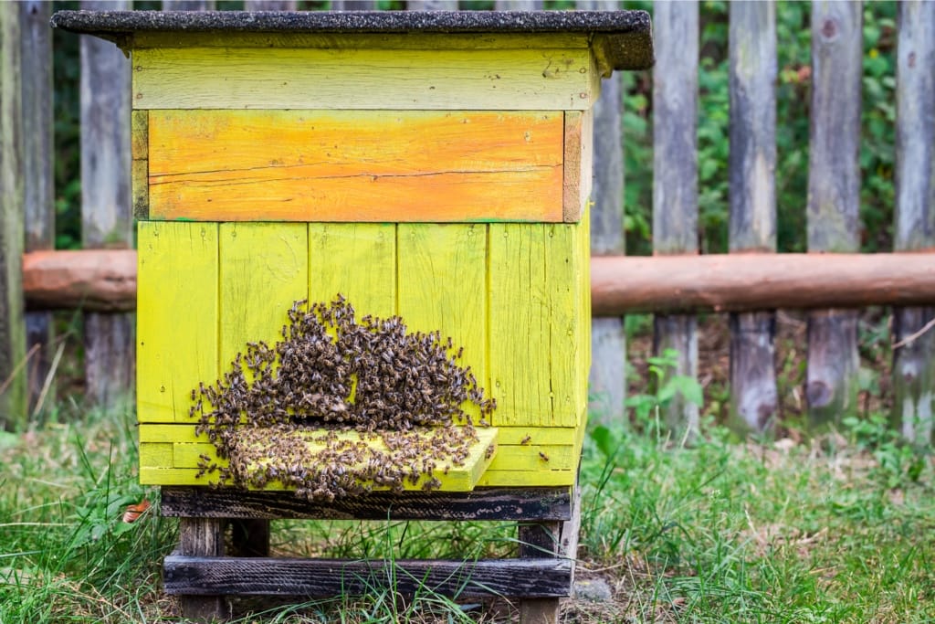 What you see: Bees lined up at the entrance with their abdomens raised, wings beating rapidly. The entrance might look crowded, but organized.